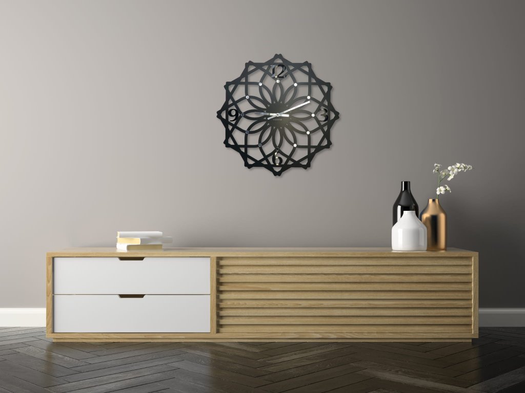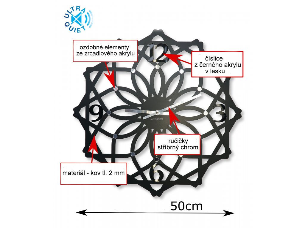 Kvalitní moderní hodiny SOTTILE jsou vyrobeny z kovu tloušťky 2 mm. Povrch je lakován do černé saténové barvy. Dekorativní elementy i číslice jsou ze zrcadlového akrylového skla. Ručičy jsou rovněž kovové. Jde o kvalitní výrobek třídy Premium, který je nepostradatelným doplňkem každého bytu už jako ukazatel času nebo dekorace na zeď. Mechanismu je moderní elektronické zařízení bez tzv. tikání. To zaručuje tišší provoz. Hodiny jsou na 1 ks baterie AA, které jsou součástí balení.