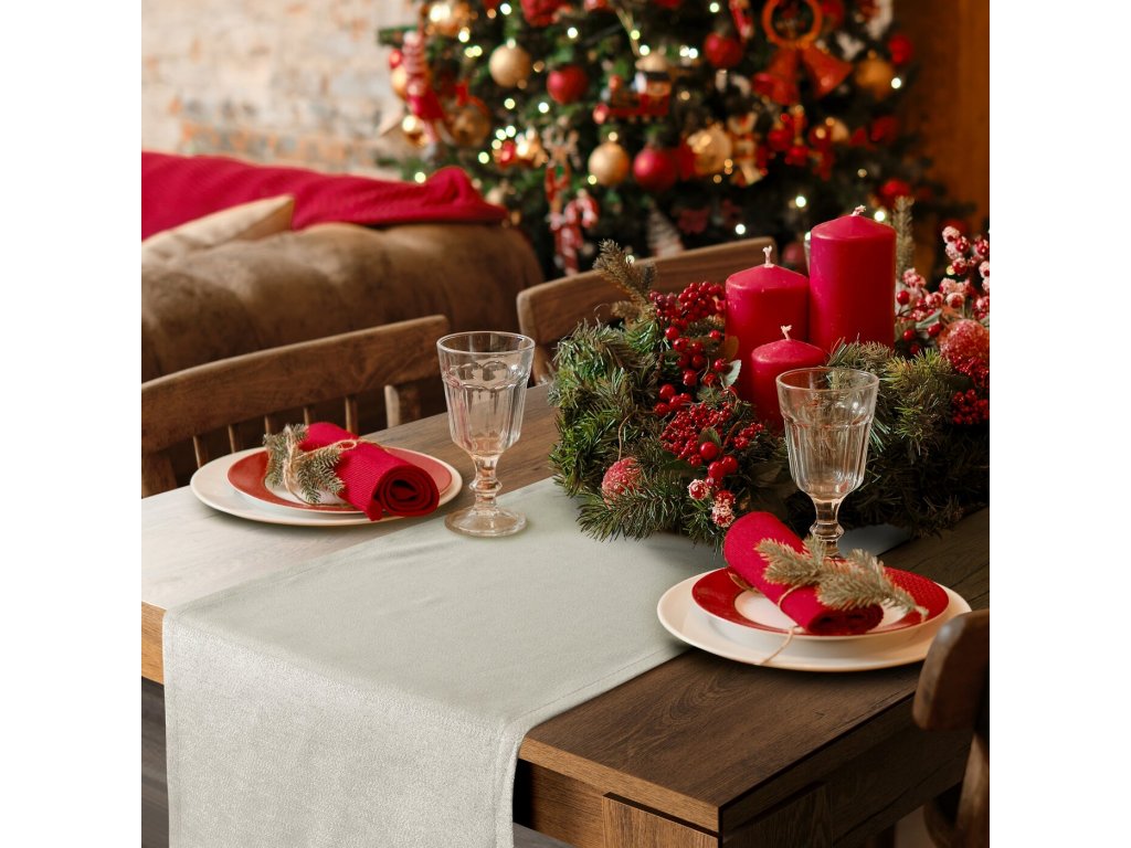 Slavnostní stůl je ústředním místem pro setkání a oslavy jídla, které vyžaduje jedinečné prostředí. Ubrus FLASH z žakárové látky stříbrného třpytue mimořádně vkusný a zároveň svou formou jednoduchý ubrus, který slavnostně ozdobí stůl. Elegantní, lesklý ubrus dokonale ozdobí vánoční stůl a navodí sváteční atmosféru při společných vánočních setkáních. Látka, která je mixem bavlny, polyesteru a metalické nitě, je nenáročná na údržbu. Vyberte si vkusný běhoun z kolekce FLASH vyrobený z elegantní žakárové látky a užijte si jedinečnou atmosféru tohoto zvláštního ročního období.